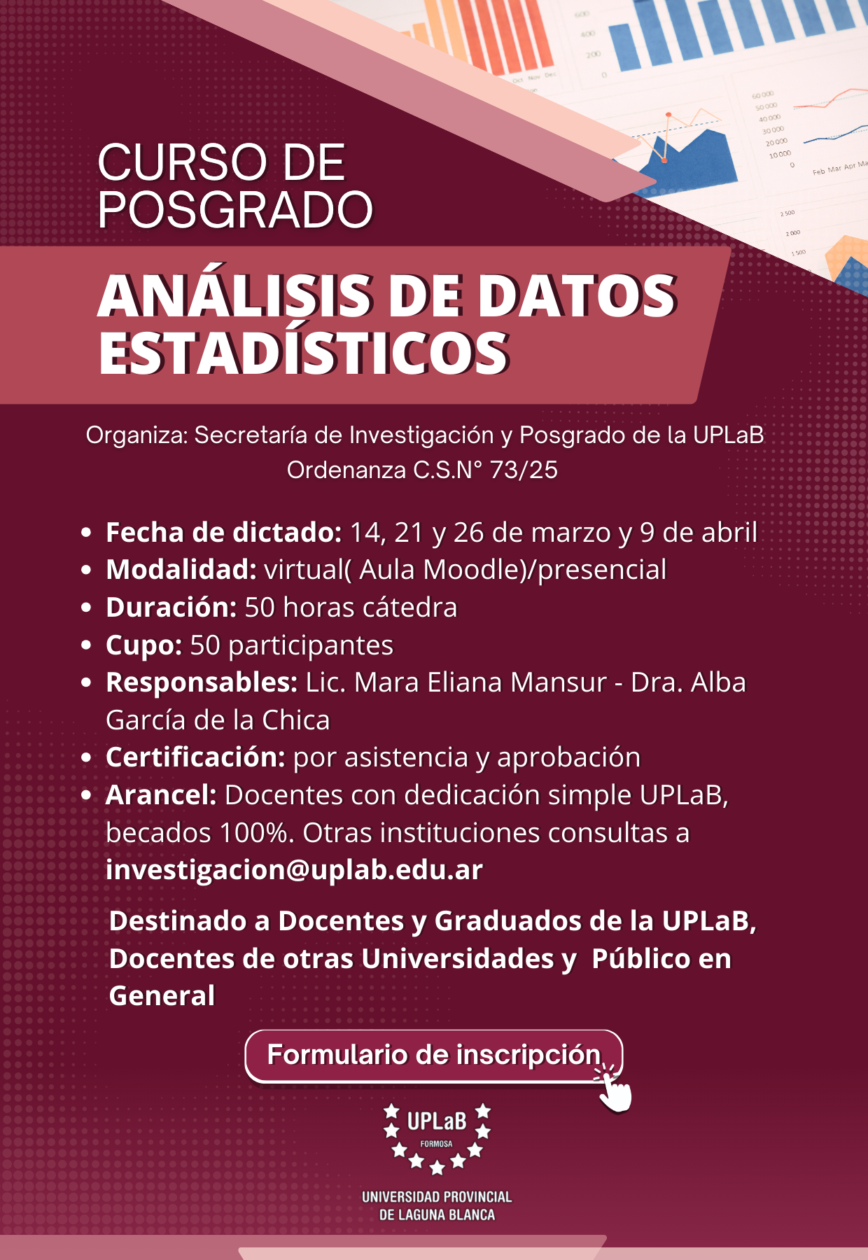 La Secretaría de Investigación y Posgrado de la Universidad Provincial de Laguna Blanca invita a participar del Curso de Posgrado “Análisis de Datos Estadísticos”, destinado a docentes, investigadores y público interesado en fortalecer sus competencias en el tratamiento y análisis de información.