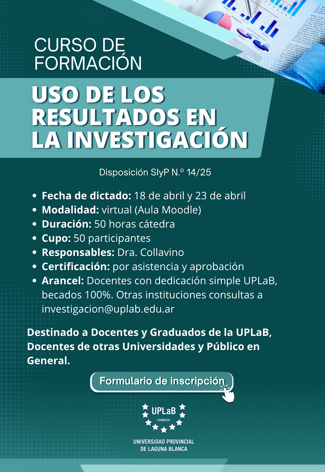 La Secretaría de Investigación y Posgrado de la Universidad Provincial de Laguna Blanca invita a participar del curso “Uso de los resultados en la investigación”, aprobado por Disposición SIyP N.º 14/25, destinado a docentes de la institución interesados en fortalecer sus competencias en la interpretación, análisis y comunicación de resultados de investigación.